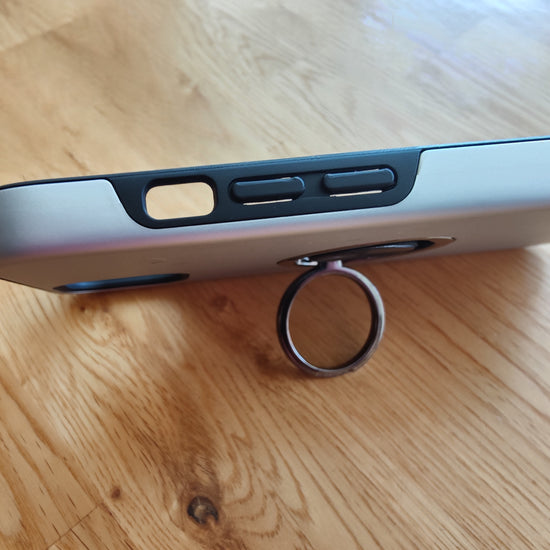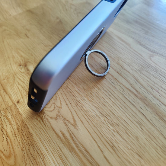 Der er en ring bagpå som har 2 funktioner, stikker man sin finger igennem ringen i brug er risikoen for at man taber telefoner, meget lille og den kan "hænge" af sig selv mens man skriver eller læser beskeder.